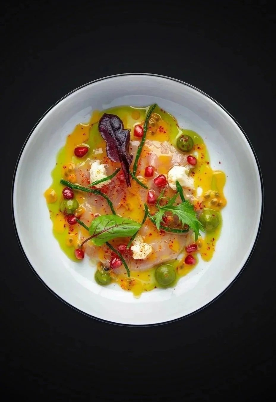 Sériole cuite au sel, fruit de la passion, huile d’olive et basilic thaï